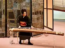 The koto (箏) is a Japanese plucked half-tube zither instrument, and the national instrument of Japan. It is derived from the Chinese zheng and se, and similar to the Mongolian yatga, the Korean gayageum and ajaeng, the Vietnamese đàn tranh, the Sundanese kacapi and the Kazakhstan jetigen.[1] Koto are roughly 180 centimetres (71 in) in length, and made from Paulownia wood (Paulownia tomentosa, known as kiri). The most common type uses 13 strings strung over movable bridges used for tuning, different pieces possibly requiring different tuning. 17-string koto are also common, and act as bass in ensembles. Koto strings are generally plucked using three fingerpicks (tsume), worn on the first three fingers of the right hand.