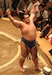 Kotoshōgiku Kazuhiro (Japanese: 琴奨菊 和弘, born 30 January 1984 as Kazuhiro Kikutsugi (菊次 一弘, Kikutsugi Kazuhiro) in Yanagawa, Fukuoka) is a Japanese former professional sumo wrestler. Wrestling for Sadogatake stable, he made his professional debut in 2002, and reached the top division in 2005. In 2011 he achieved the standard for promotion to the second highest rank of ōzeki by winning 33 bouts over three tournaments, and was formally promoted by the Japan Sumo Association on 28 September.[1]