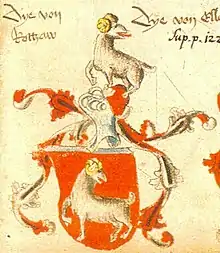The House of Kotzau took its name from the village of Kotzau, today called Oberkotzau and it is located in the district Hof in Upper Franconia. Famous members of the family were abbess in the abbeys of Himmelkron and Hof. Hans von Kotzau fought against the hussites at Wunsiedel in 1430. In Second Margrave War Georg Wolf of Kotzau, originally a knight in the fellowship of Albert Alcibiades, Margrave of Brandenburg-Kulmbach, turned against his prince and supported Henry IV, Burgrave of Plauen. 1553 the town of Hof was besieged, captured and Georg Wolf was appointed to be governor. The family was directly related with the Houses of Guttenberg, Sparneck and Zedtwitz. The last knight died in 1661 in a duel.