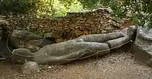 The kouros in the quarry, also known as the Kouros of Potamia or the Kouros of Faranga, is located about halfway up a 300 metre high marble outcrop and is 5.0 metres long. This statue is also unfinished and its legs are also broken off, probably as a result of being dropped at the quarry during transport, in the spot where it still remains. The figure lies on its back, away from the rock from which it was originally cut.[2] Further issues are visible. The face is missing, clear scratches are visible on the foot stumps. The roughly worked feet of the figure lie nearby, mounted on a much more recent concrete foundation.