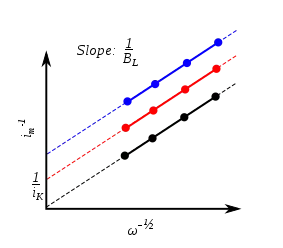 From an experimental data set where the current is measured at different rotation rates, it is possible to extract the kinetic current from a so-called Koutecký–Levich plot. In a Koutecký–Levich plot the inverse measured current is plotted versus the inverse square root of the rotation rate. This will linearize the data set and the inverse of the kinetic current can be obtained by extrapolating the line to the ordinate. This y-intercept corresponds to taking the rotation rate up to infinity, where the reaction is not mass-transport limited. Koutecký–Levich analysis is therefore used to determine the kinetic constants of the reaction such as the kinetic constant and the symmetry factor .