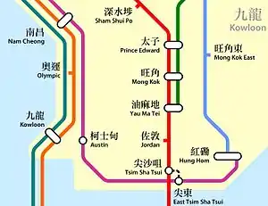The Kowloon Southern link is a section of the MTR Tuen Ma line, linking Nam Cheong station and East Tsim Sha Tsui station. The rail link is fully underground, lies along the south-west coastline of Kowloon Peninsula, east of rail tracks of the Tung Chung line and Airport Express. Kowloon Southern Link has one underground intermediate station called Austin station (formerly West Kowloon station). It is located adjacent to the Canton Road Government Offices,[1] close to Kowloon station of Tung Chung line and Airport Express. However, the structures do not provide a direct transfer between the two stations.