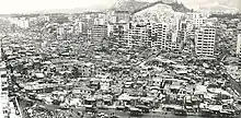 In January 1950, a fire broke out that destroyed over 2,500 huts, home to nearly 3,500 families and 17,000 total people.[11] The disaster highlighted the need for proper fire prevention in the largely wooden-built squatter areas, complicated by the lack of political ties with the colonial and Chinese governments.[12] The ruins gave new arrivals to the walled city the opportunity to build anew, causing speculation that the fire may have been intentionally set.[12][13]