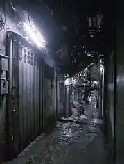 A partial recreation of the Kowloon Walled City existed in the Warehouse Kawasaki, an amusement arcade that operated from 2009 to 2019 in the Japanese suburb of Kawasaki, Kanagawa. The atmosphere of the walled city was reflected in the arcade's narrow corridors, electrical wires, pipes, postboxes, sign boards, neon lights, frayed posters, and various other small touches.[87]