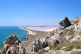 Koyashskoye or Koyashs'ke is a salt lake on the coast of the Kerch Peninsula in Crimea, separated from the Black Sea by a strip of land. It is 4 kilometers long, 2 kilometers wide and a meter deep. The lake has the particularity to have a pink to scarlet color, depending on the light, due to the presence of microscopic algae living in the water. When the water evaporates, the salt in the lake crystallizes on the stones and the shores, producing crystal stones and the scent of viola. Uzunlarske Lake is located directly west.