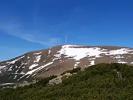 Kráľova hoľa (Slovak pronunciation: [ˈkraːʎɔʋa ˈɦɔʎa]; German: Königsberg; Hungarian: Király-hegy,[1] literally "King's Bald Mountain") is the highest mountain (1,946 m) of the eastern part of the Low Tatras in central Slovakia. Four rivers rise at its foot: Čierny Váh, Hnilec, Hornád, and Hron. The summit, easily accessible by hiking trails from Telgárt as well as by a paved road from Šumiac (not open to motor vehicles, except for the mountain rescue service and maintenance workers of the TV transmitter on the summit), offers a panoramic view of Spiš, the Tatras, Liptov, and the Upper Hron Valley. Largely deforested by exploitative timber harvesting in the early 19th century, its timberline was restored to its natural elevation of about 1,650 m (5,413 ft.) through the efforts of Ludwig Greiner in the second half of that century.[2]