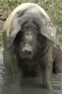 Krškopolje pig or Black-belted pig[1] (Slovene: Krškopoljski prašič) is an autochthonous breed of pig, originating in Slovenia.[2] This pig represents the only still preserved Slovenian autochthonous breed of domestic pig.[1] The easily recognizable blackish Krškopolje pig, widely used for meat production, is well known for its continuous pink belt, running across animal's shoulders and forelimbs.[2]