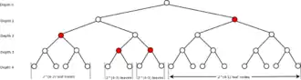 Here the sum is taken over the leaves of the tree, i.e. the nodes without any children. The depth is the distance to the root node. In the tree to the right, this sum is