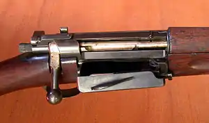 The rifle had a feature known as a magazine cut-off. This is a switch on the left rear of the receiver. When flipped up (on the Norwegian Krag-J rifles and carbines), the cut-off does not allow cartridges in the internal magazine to be fed into the chamber by the advancing bolt. This was intended to be used for firing single rounds when soldiers were comfortably firing at distant targets, so the magazine could be quickly turned on in case of an incoming charge or issue to charge the enemy. This instantly gives five rounds to the shooter for quick firing. The M1903 Springfield that replaced the Krags had a magazine cutoff, as did the SMLE (Lee–Enfield) until 1915.