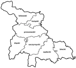 In 1138, following the Testament of Bolesław III Krzywousty, the Duchy of Kraków was granted to Wladyslaw, the eldest son of Krzywousty. Boundaries of the duchy were most likely the same as boundaries of Kraków Voivodeship. In 1397, three counties were created: Kraków, Proszowice and Zarnowiec. In the 16th century, there were seven counties in the voivodeship: Proszowice, Szczyrzyc, Lelów, Książ Wielki, Silesian, Biecz and Nowy Sącz (...)