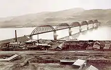 Krasnoyarsk Railway Bridge in Krasnoyarsk, Siberia, carries the Krasnoyarsk Railway (part of the Trans-Siberian Railway) across the Yenisei River. It was originally a single-track truss bridge. The total length of the structure was 1 km, span width of 140 meters, the height of metal trusses in the vertex of the parabola was 20 meters.