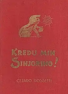 Kredu min, Sinjorino! (Believe me, Madam!) is an Esperanto-language novel by Cezaro Rossetti. It is listed in William Auld's Basic Esperanto Reading List and was published for the first time in 1950, the same year in which Rossetti died.