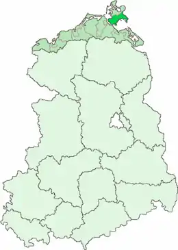 Kreis Putbus covered the southern part of the island of Rügen including the peninsulas of Mönchgut and Zudar. The following subdivisions belonged to the district: the towns of Garz and Putbus and the municipalities of Alt Reddevitz, Altefähr, Altensien, Binz, Dreschvitz, Gager, Groß Schoritz, Gustow, Göhren, Jarkvitz, Karnitz, Kasnevitz, Lancken, Middelhagen, Neu Reddevitz, Baabe, Poseritz, Rambin, Samtens, Seedorf, Sehlen, Sellin, Swantow, Thießow, Zirkow and Zudar.[2]