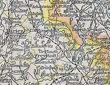 After the First Partition of Poland in 1772, the area of the future Rosenberg district was assigned to the newly created province of West Prussia as part of the Marienwerder district. As part of a comprehensive district reform in Regierungsbezirk Marienwerder, the new Rosenberg district with the capital at Rosenberg in Westpreußen was formed on 1 April 1818 from the eastern part of the Marienwerder district. The district included Bischofswerder, Deutsch Eylau, Freystadt, Riesenburg and Rosenberg.[1]