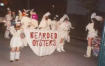 ![]() The "Bearded Oysters" dance troupe on a balcony before the start of the parade |