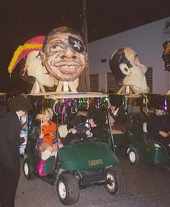 The parade traditionally features golf cart floats with effigy heads of notable Carrollton characters, including James Booker. Additionally, there are jazz brass bands, dance troupes, and home-made floats and costumes.
