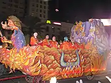 The Krewe of Proteus is the longest riding "Old Line" Night Parade Krewe in New Orleans Carnival after the Mistick Krewe and the Knights of Momus, stopped parading in 1992.[1][2][3] The parade of the krewe of Proteus traditionally travels an Uptown or St. Charles route ending on Canal Street. Parade floats still use original chassis from the early 1880s. Proteus is an offshoot of Mistick Krewe, and Knights of Momus - formed because the Mistick Krewe's waiting list was too long. Supposedly the Captain of the Mistick Krewe made the suggestion to form Proteus, as it was taking even too long for younger men of Comus families to get into Knights of Momus.[4]