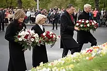 Throughout Kariņš' term as prime minister, relations between Latvia and Russia significantly worsened, particularly following the 2022 Russian invasion of Ukraine. At the Riga StratCom Dialogue in May 2022, Kariņš said that, "in order to ensure peace and security in Europe and the world, Russia must lose this war. Ukraine must win. This is the only way we can return to a peaceful life".[66] At the same meeting, he also criticized certain western European leaders' perceived willingness to negotiate with Russia over the conflict.[67] In a summit of Baltic sea countries in Copenhagen, Kariņš said that "countries surrounding the Baltic Sea should minimise economic cooperation with Russia, especially in the energy sector".[68] On 25 August 2022, a Soviet war memorial that had been protected under a treaty between Latvia and Russia was torn down. Kariņš said that along with decreasing energy dependence on Russia, this action "freed Latvia from the lasting consequences of occupation."[69] On 8 September 2022, the Kariņš government approved additional restrictions on the entry of Russian citizens into Latvia via the external border of the European Union, with Kariņš saying that Russian citizens freely moving around the EU while Russia invaded Ukraine was " unacceptable both from a moral and security considerations".[70]