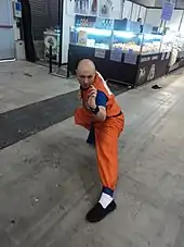 Krillin's appearance stays relatively the same for the majority of the series. He is first introduced at age 13, with a shaved head and still dressed in the yellow-and-orange clothing worn at the monastery at which he had been training. He does not possess a visible nose, and has six spots of moxibustion burns on his forehead called jieba, a reference to the practice of Shaolin monks. Toriyama once stated, seemingly humorously, that Krillin's lack of a nose is because he has a "physical idiosyncrasy" that allows him to breathe through the pores of his skin.[9] Later, he wears the orange gi uniform that is presented to both himself and Goku by Kame-Sen'nin in honor of their first martial arts competition.[10] Occasionally he is seen in casual clothes, but for the most part continues to dress for training or fighting at all times.[11] During the Frieza arc, he wears Saiyan armor provided by Vegeta,[12] but during the Cell arc he returns to wearing the orange gi, accompanied by a blue short-sleeved undershirt and boots.[13] After the defeat of Cell, Krillin stops shaving his head, and grows his black hair out, before later shaving it again during Frieza's resurrection.[14] When he settles down with his family, Krillin is shown wearing a workout outfit consisting of a red "Tacos" T-shirt and brown drawstring pants.[15]