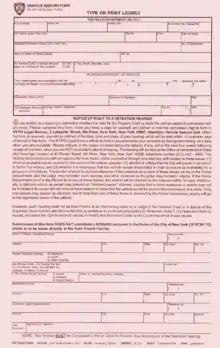 The NYPD began seizing vehicles upon the arrest of the driver in the 1980s pursuant to a city ordinance that allowed for such forfeiture when the vehicle was used as an instrument of a crime.[6][7][8] Vehicles were regularly confiscated from people charged with both misdemeanors and felonies, ranging from drug possession and solicitation of prostitution to illegal gun possession.[6] Unlike the older New York State civil forfeiture statute, the NYC law did not provide for any type of prompt due process hearing.[9] Vehicles were held for months and even years while owners waited for the NYPD to bring civil forfeiture actions.[10] The vast majority of the time, however, these forfeiture actions never came. In 1998, for example, of the 1,800 vehicles seized, less than one percent went to trial.[11] In 1999, the NYPD added driving while intoxicated (DWI) to the list of crimes that they would impound vehicles for, resulting in thousands of additional seizures.[12]