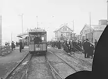 Test runs started on 10 January 1894.[5] The official opening of the first Nordic electric tramway took place on 2 March 1894 and ordinary operation commenced the following day. It was the seventh electric tramway to open in Europe. Amongst the concerns in the public debate was that horses, such as those from the competing KSS, would not be able to cope with seeing a tram running without being pulled by a horse. The competitor's labor union proposed that KES used stuffed horses in front of their trams, but the horses soon learned to cope with the autonomous vehicle.[6] At first the trams ran every six minutes, but this proved difficult to operate and it was reduced to an eight-minute headway.[7]