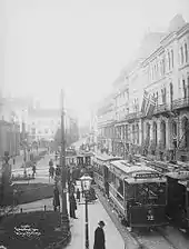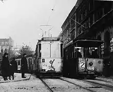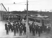 The third connection opened in 1915, linking Jernbanetorget to the Kampen Line and the Vålerenga Line through a connection along Vognmannsgata, Brugata and Vaterland Bridge.[23] By 1915 the street tram network consisted of thirteen services, of which two were operated by KES and six were joint operations. All services via Homansbyen and Frogner to Majorstuen were joint services. The joint services were operated the relative number of trams in proportion of the ownership of trackage along the line and where each company simply kept the revenue it created on their services.[25] The first women conductors were hired in 1916.[26] Ten older Class A trams were rebuilt with larger wheelbase and bodies in 1918 and 1919, supplemented by 37 new motor trams and 56 new trailers.[27]