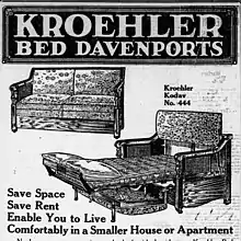 Kroehler /ˈkreɪlə/[1] Manufacturing Company was a furniture company and was originally incorporated as the Naperville Lounge Company, on March 9, 1893.[2] It was founded by ten original stockholders. In 1896, Peter Kroehler, an employee, offered to purchase the stockholder's interest at its book value. The offer was taken, and at the beginning of 1896 a new group of four partners took over the business. In 1897, the company found a new headquarters next to the C. B. & Q tracks in Naperville IL. On April 6, 1903, Peter Kroehler was made president of the company. On April 1, 1915, the name "Kroehler Manufacturing Company" was adopted, as the company had four factories now operating under various names, which was inconvenient. Kroehler Manufacturing Company later became the world's largest furniture company.[3] During the 1970s, the company started operating at a loss, closing its historic Naperville factory in 1978 and ending its operations in the area. In 1981 Kroehler Manufacturing Company was acquired by the ATR Group of Northbrook, which sold off the furniture plants and the Kroehler name.[4][5]