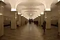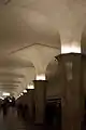 Since it was to serve as the gateway to the Palace of Soviets, great care was taken to make Kropotkinskaya suitably elegant and impressive. The station has flared columns faced with white marble which are said to have been inspired by the Temple of Amun at Karnak. Contrary to popular opinion, the marble used in the station did not come from the demolished Cathedral. The spacious platform is covered with squares of gray and red granite and the walls, originally tiled, are now faced with white Koyelga marble. The station is illuminated by concealed lamps set into the tops of the columns.