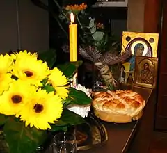 The Slava is a family's annual ceremony and veneration of their patron saint.[2] It is a tribute to the family's first ancestor who was baptized into Christianity, with its presiding saint.[3] The family's patron saint is passed down from father to son and only males are allowed to carry out the Slava's rituals.[4] Upon marriage, women typically adopt the patron saint of their spouse although it is not uncommon for them to continue celebrating their native family's saint as well (in which case the secondary one is known as preslava).[3] Close friends and family gather at the home for a ritual feast. Although a religious ceremony for the purpose of saint veneration, the family's intent behind the celebration is for "the good health of the living" as well as for a "general remembrance of the souls of the departed family members".[3]