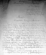 In 2006, a handwritten diary by Misirkov written during his stay in Russia in 1913 was discovered. It was declared authentic by Bulgarian and Macedonian experts and was published in 2008.[41] The content of the diary clearly shows that at the time, Misirkov identified himself as a Macedonian Bulgarian and had a clear pro-Bulgarian stance.[42][43][44] It has given rise to new public discussion over Misirkov's stances on Bulgarian and Macedonian ethnicity.[45] Per academic Alexis Heraclides, Misirkov's stance was not clear-cut and he sounded Macedonian at times too.[46] The manuscript includes 381 pages written in the Russian language. Misirkov wrote it in Kotovsk's nearby village of Klimentove, where he lived and worked at the time. It contains also articles and excerpts from the Russian press of that time.