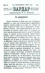 Misirkov was the author and editor of the first scientific magazine in Macedonian. The magazine Vardar was published in 1905 in Odessa, Russian Empire. The magazine was published only once, because of the financial problems that Misirkov had been facing with at that time. He expressed views about the national distinctiveness of the Macedonians.[16] The magazine has been published in Macedonian, and the orthography that has been used is almost same as the orthography of standard Macedonian.[40] The magazine was meant to include several different scientific disciplines, mostly concerned with Macedonia.