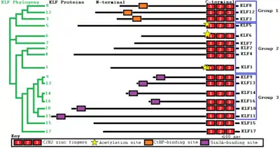 KLFs are divided into three subgroups; Group 1 (KLF 3,8, and 12) are repressors via interaction with the C-terminal Binding Protein 1 and 2 (CtBP1 and CtBP2). Group 2 (KLFs 1,2,4,5,6, and 7) are transcription activators. Group 3 (KLFs 9,10,11,13,12, and 16) have repressor activity via interaction with the common transcriptional co-repressor, Sin3A. KLFs 15 and 17 are distantly related without any defined protein interaction motifs.[4]