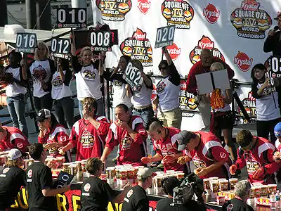 - 2006: The event, taking place at the First Tennessee Pavilion, was televised live on ESPN2 for the first time. Kobayashi and Chestnut both topped the event's world record near the midpoint of the contest, with Kobayashi (97 Krystals) taking the victory. Patrick "Deep Dish" Bertoletti, of Chicago also broke the previous world record, finishing third with 76. The winners split a $30,000 purse. An amateur event, dubbed the Krystal Sackful Challenge, was held prior to the main event. It featured two-person teams chosen from the audience, eating as many Krystals as possible in two minutes. The winners of the inaugural challenge were Matt Alling, 24, of Birmingham, and Bruce Clements, 23, of Chattanooga.[2]