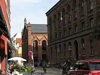 On the opposite side of Fiolstræde is the Great Synagogue of Copenhagen. It was designed by Gustav Friedrich Hetsch.[5] It is located across the street from Copenhagen Central Library. The two-story building on the corner with Peder Hvitfeldts Stræde is a former Latin school associated with the Church of Our Lady. The building is from 1821.[6]