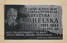 Krystyna Krahelska "Danuta" (24 March 1914 – 2 August 1944) was a Polish poet, ethnographer, member of the Home Army, and a participant in the Warsaw Uprising.