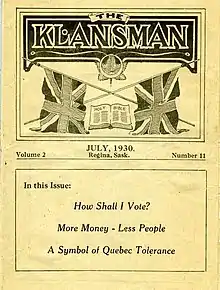 In 1926, American Ku Klux Klan organizers Hugh Finlay Emmons and Lewis A. Scott from Indiana established a Klan organization in Saskatchewan.[17] They spent most of early 1927 travelling throughout the province, establishing local Klan branches and selling memberships for Can$13 per individual.[20] They also spread Klan propaganda and burned crosses, and in July and August 1927 they made another tour of the province.[20]