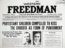 Klansmen believed that Canada's immigration policy made it the dumping ground of the world.[14] They falsely stated that of Regina's 8,000 recent immigrants, only 7 were Protestants.[14] They promoted a "100 percent Canadian" policy to deter the declining influence of Protestant Anglo-Saxon Canadians as a result of increasing immigration from Europe, particularly Eastern Europe, which was primarily Roman Catholic and Jewish.[22]