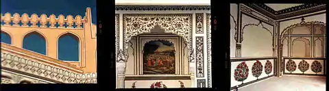 The Meera Mahal is a palace inside the premises of fort which plays host to the miniature paintings illustrating the life story of Rathore poet-saint Meerabai, the passionate devotee of Lord Krishna. The passion and dedication with which Meera (a married Rajput woman) worshiped Lord Krishna has been a part of the folklore for ages and is still considered to be one of the finest efforts by any devotee to evince the allegiance to the Lord. Thakur Ranjit Singh constructed the Mahal (Palace) and its temple in 1832, which contains lok devta and gurus.[29]
