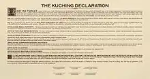 The Kuching Declaration (Iban: Jaku penetap Kuching, Malay: Perisytiharan Kuching) is a declaration in English was adopted by the three component parties of the Pakatan Rakyat (i.e. People's Justice Party (PKR) signed by Anwar Ibrahim and Baru Bian, Democratic Action Party (DAP) signed by Lim Kit Siang and Wong Ho Leng, Pan-Malaysian Islamic Party (PAS) signed by Abdul Hadi Awang and Adam Ahid) coincide with Malaysia Day celebrations on 16 September 2012 held at Chonglin Park, Kuching, Sarawak, the declaration pledge and promise will honour the spirit of the Malaysia Agreement of 1963 to the nations and the peoples of the States of Sarawak and Sabah[1] that when they form the next government of the Malaysia they will honour all its pledges and promises in this declaration.[2]