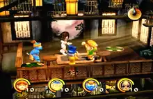 Kung Fu Chaos is a fighting game that takes place within the shooting of a fictional film of the same name, with the director Shao Ting acting as narrator and guide to the gameplay. In line with this theme, the game's stages reflect various scenes of the film being shot. Gameplay features several modes, including 'Ninja Challenge', a campaign mode with a progression of unlockable scenes consisting of 'Main Feature' levels and various minigames. 'Main Feature' scenes require players to fight and survive levels within a time limit. Players progress and unlock further scenes if the players beat bosses in the time allotted and receive sufficient stars on the 'Star Meter', which gradually increases as the player defeats enemies in the level. Other modes in the game include 'Battle Game', allowing for local multiplayer play of an unlocked level selected by the player, 'Championship' and 'Miniseries', a series of random levels chosen by the computer, 'Freestyle', an arena-style fight in a single area, and 'Rehearsal', a practice mode.[2]