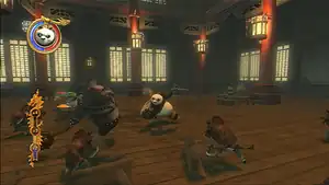 Kung Fu Panda is based on the movie Kung Fu Panda. Players initially control Po, who differs from the movie in that he possesses a basic level of martial arts skill from the beginning, enabling him to participate in battle. In addition to fighting and jumping challenges, maintaining balance is another important element of the game, such as Po crossing tightropes, staying on moving platforms, and steering a boat through a dangerous river. Over the course of the game's narrative, the player improves Po's skill by adding various new fighting techniques and special moves, although in some parts of the game, the player will have to complete the tasks as another character.