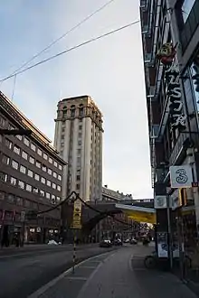 Kungsgatan passes by Hötorget public square where Stockholm Concert Hall is located. It is also flanked by two buildings, the Kungstorn (King's towers), each about 60 metres tall.