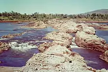 The history of the idea of agriculture on the Ord River dates from the 19th century. On the first pastoral lease map (held by WA State Records Office) for the area dated 1887, it shows the northern bank between Wyndham and Kununurra, near House Roof Hill was held as a "Concession for Sugar Cane Planting," although it was never taken up. The idea of tropical agriculture on the Ord was discussed much from the earliest dates, but the land remained under pastoral lease until 1960. Kununurra was built on land resumed from Ivanhoe Station pastoral lease before 1961,[4] as the town for the Ord River Irrigation Area which started as the Ord River Project or Ord Scheme, with survey work starting in 1959. Lake Kununurra is the flooded section of the Ord River valley that was formerly known as Carlton Reach, which was at times a 10-kilometre-long (6.2 mi) waterhole held back by the natural rock barrier known as Bandicoot Bar. At this site in 1959 drilling and blasting marked the start of construction of the Ord River Diversion Dam, which is anchored down onto the Bandicoot Bar. This dam with twenty radial flood gates was almost completed when visited by Queen Elizabeth II and Prince Philip in March 1963, then later completed and officially opened by then Prime Minister, Robert Menzies on 20 July 1963 when he said that Kununurra and the Ord River Irrigation Area (ORIA) is "... the most exciting place in Australia".