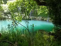 The Kurşunlu Waterfall (Turkish: Kurşunlu Şelalesi) is located 19 km from Antalya, Turkey at the end of a 7 km road branching off to the north of the Antalya-Serik-Alanya highway at a point 12 km east of Antalya. It is reduced to a mere trickle in the summer months.