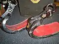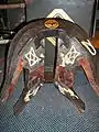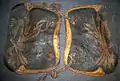 Shita-kura or hadazuke, the twin set of double leather pads attached to the bottom of a Japanese saddle tree (kurabane). The shita-kura (hadazuke) protects the back of the horse from the kurabane.