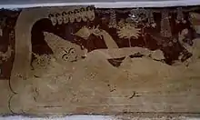 Later, a tribal king visited the Swetha Pushkarani and was impressed with it. After learning about the story of its origin from Swetha Chakravarthi, the tribal king constructed a tank around the lake and began worshipping the deity regularly. The tribal king used to stay in Sage Sampangi's monastery, which was situated in the Western side of the temple. Upon the king's request, the deity started facing west.[13] The sage Durvasa visited the temple later with his disciples; the event of his arrival was considered significant. Rama's sons Lava and Kusha were said to have worshipped Vishnu as Kurmanatha in Srikurmam.[14] In Dvapara Yuga, Balarama visited the temple and was denied entry by Bhairava, who was serving as the temple's Kshetrapala (guardian deity). Infuriated, Balarama threw Bhairava away from the temple premises. Kurmanatha learned of this and gave Balarama permission to enter the temple. Balarama, in resentment, cursed that Srikurmam would be the only temple where Vishnu would be worshipped in the form of Kurma Narayana.[13] Legends also say that upon Vishnu's request, Anjaneya agreed to guard the temple.[14]