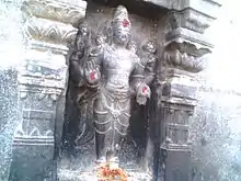 During the reign of king Swetha Chakravarthi, this area was referred to as Swetha Giri. Swetha Chakravarthi's wife Vishnu Priya was a devotee of Vishnu.[13] When she was observing a fast on an Ekadasi day, Swetha Chakravarthi approached her with the intention of making love. When she refused, saying the time was not ideal, the king became adamant. She prayed to Vishnu, who created a stream of water, separating the couple. Swetha Chakravarthi was carried away in the ensuing flood and Vishnu Priya followed him to the hilly terrains of Swetha Giri.[13] The sage Narada initiated an upadesam of the Kurma Narayana mantra and asked the king to pray to Vishnu using it. By the time Vishnu appeared in the form of the Kurma (tortoise) avatar, the king's health had deteriorated. Vishnu then made his Sudarshana Chakra make an impression in the nearby land, forming a lake.[13] Swetha Chakravarthi bathed in the lake and regained his health, after which it was referred to as Swetha Pushkarani.[13] Upon the king's request, Vishnu manifested as the deity of Kurmanatha. According to the Padma Purana, Brahma officiated the celestial rituals and consecrated the deity with Gopala Yantra.[14] Vishnu is worshipped as Kurmanatha Swamy or Kurma Narayana,[13] along with his consort Lakshmi, who is referred to as Kurmanayaki.[15]