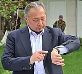 In Kyrgyzstan, Bakiev was sentenced in absentia to life in prison for involvement in the killing of protesters during the 2010 uprising.[33] The Kyrgyz government has since demanded Bakiyev's extradition, but Belarus has refused, which has been the cause of many conflicts in Kyrgyz-Belarusian relations.[34] He was accompanied by his wife Tatyana, his two sons and his Kyrgyz mistress Nazgul Tolomusheva.[35] In February 2012, it was being reported that Bakiyev was granted Belarusian citizenship in 2010.[36] In a 2017 interview with the Belarusian service of Radio Free Europe/Radio Liberty, Bakiyev claimed that Medvedev and Putin, as well as US President Barack Obama were involved in the coordination of his safe departure to Minsk.[33]