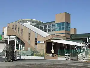 The station consists of two opposed side platforms serving two tracks, with an elevated station building over the platforms and tracks.