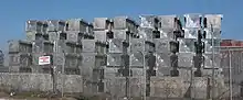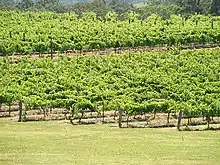 The smelter's development coincided with the establishment of several vineyards 15 km to the west of the Plant.[3] As a result of concern among vintners, a foliage monitoring program was developed to run over 30 growing seasons.[3] Additionally, concern over foliage damage to native vegetation led to the monitoring of nearby scrub, sclerophyll forest, woodland and swamp forest.[20] Both monitoring programs found the smelter to have a negligible effect on vegetation and crops.[3][20] Other Environmental assessments conducted during the 1980s include the 1981 Environmental Impact Assessment by the Department of Environment and Planning.[1] This assessment found Line I of the smelter to produce higher emissions compared to Line II due to a lack of hooding efficiencies.[1] Hooding efficiency refers to the percentage of fumes captured from aluminium smelting and should be at least 95% for prebaked pots.[21] The assessment also found that for every tonne of aluminium produced, 15 kg of fluoride is emitted as a by-product, accumulating to 675 tonnes of fluoride emissions a year.[1] In another assessment, the smelter was found to deposit the majority of fluoride pollution to the north of the plant towards Wentworth Swamp near Maitland, through both aerial and waterway transportation.[22] Between the years 1969 and 1993, spent potliner was deposited in an area east of the plant known as "Mount Alcan".[5] From 1993 onward this waste material was stored in sheds.[5]